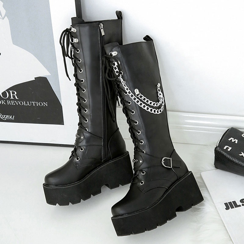 Black Wedge 3″ Platform Boots w/ Buckle and Metal Chain Adjustable Laces Anti Slip Rubber Outsole Breathable Synthetic Leather Mid Calf Lightweight for Extra Comfort Note: Black combat boots are not Hades branded but inspected by Hades Footwear’s quality control team. Please refer to attached size conversion chart to choose the best fit