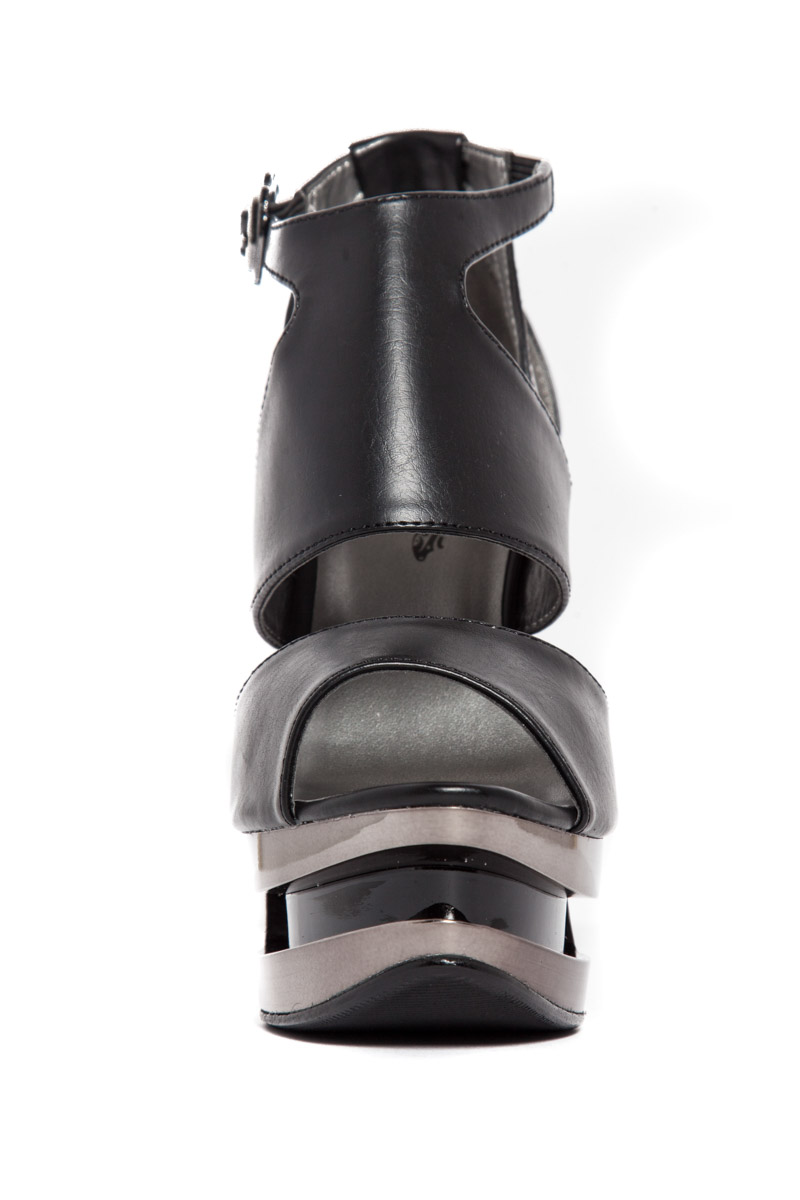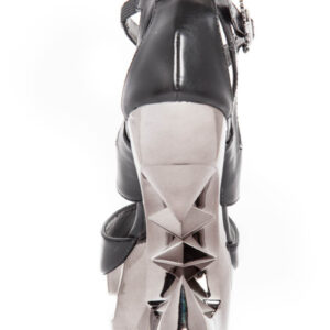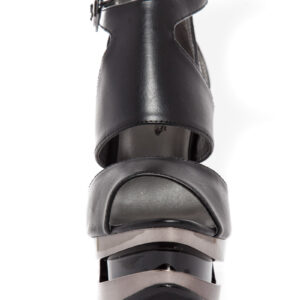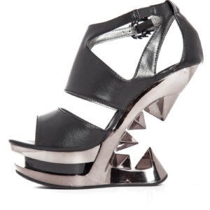 Pyramid wedge heels. Vegan leather upper. Adjustable ankle straps. 5″ height.