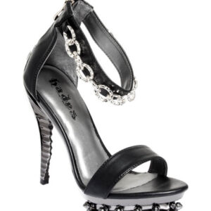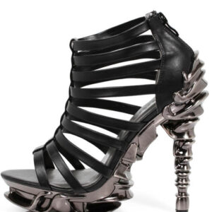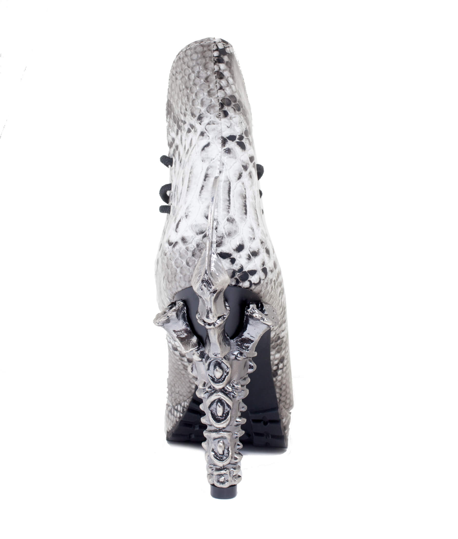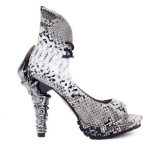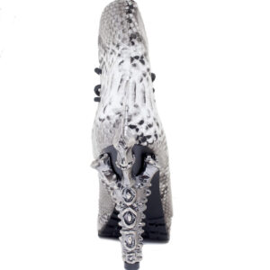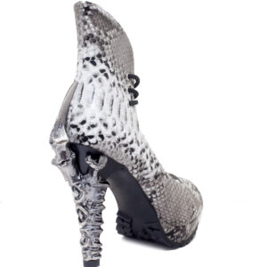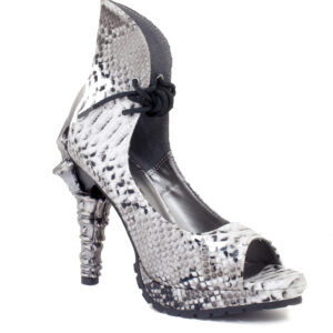 5″ Prehistoric claw heel w/ double layered rubber outsole, synthetic snake skin upper material w/ adjustable front laces. Vegan leather.