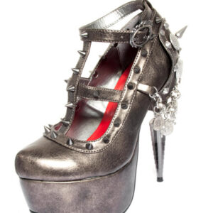 Skeleton molded ABS heel w/ spike rivets in platform. Adjustable mid & upper straps w/ silver flame buckles. Back zipper. Mock bullets