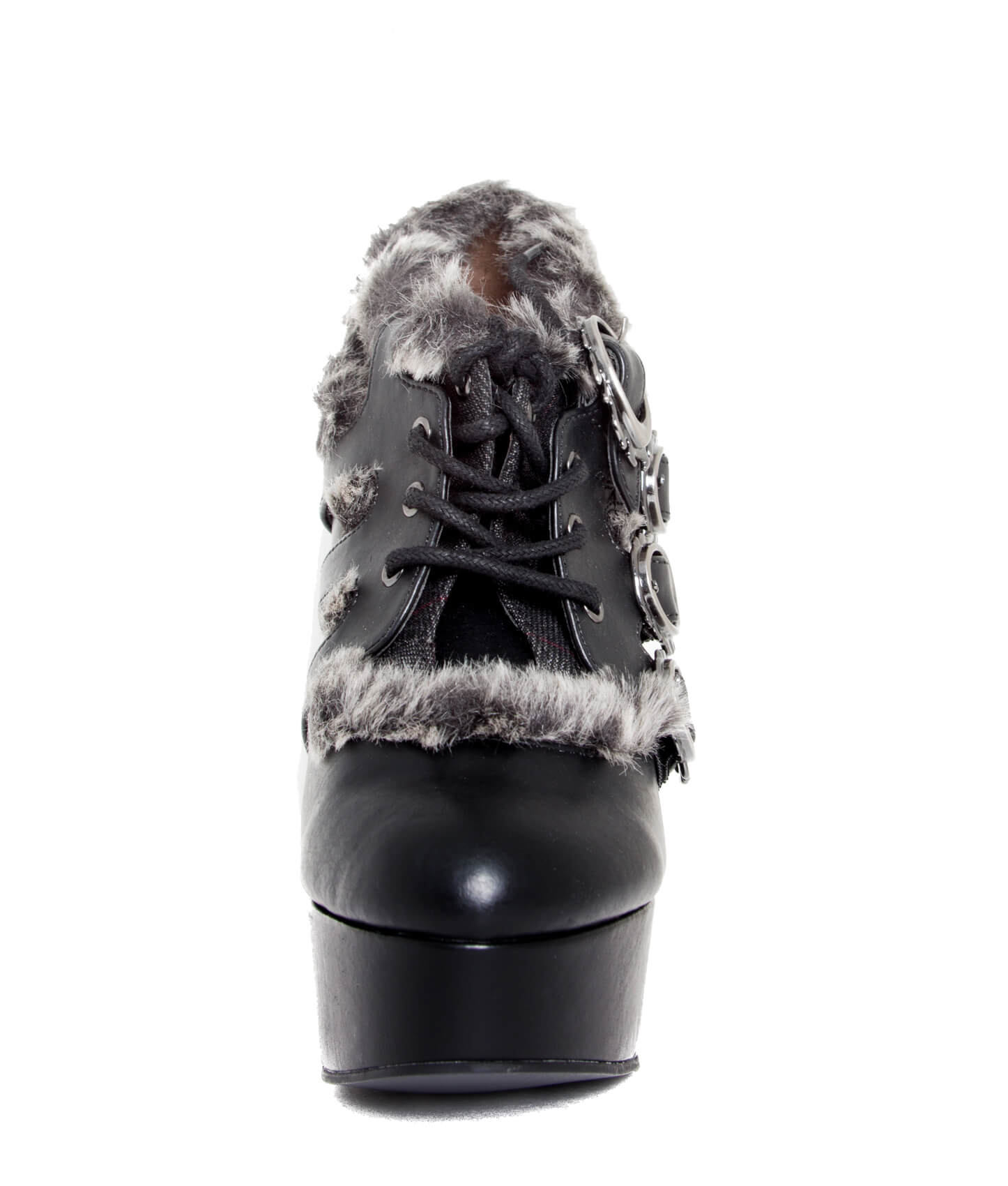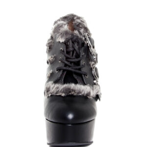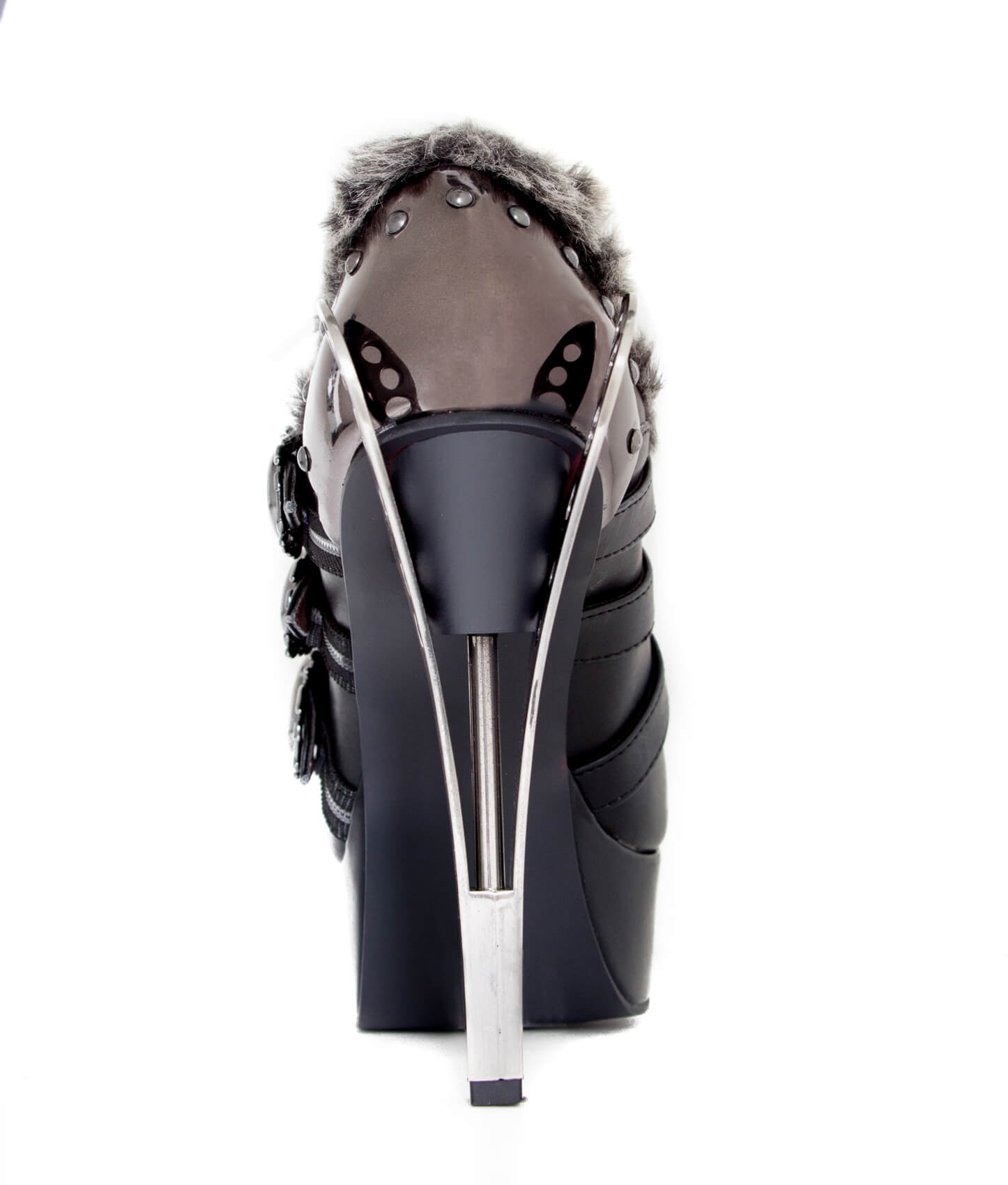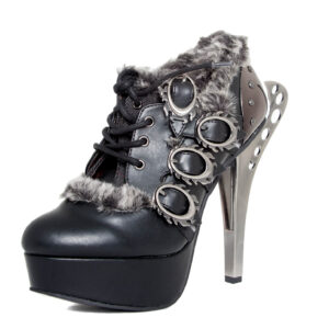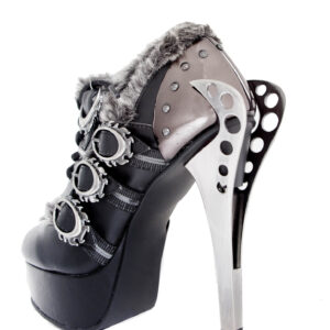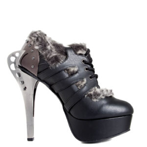 Upgraded version of our popular Morgana and Atreides styles. Industrial metal butterfly heel with matching back armor piece. Steampunk flame buckles. Flexible, elastic and adjustable front laces. Hand sewn, two toned artificial artic fur lining across edges and front.