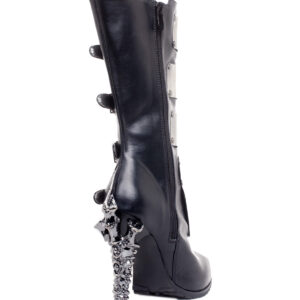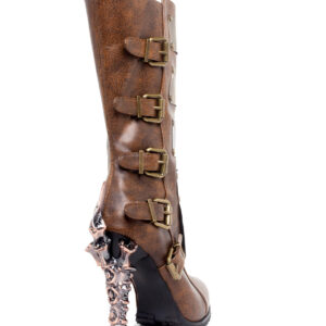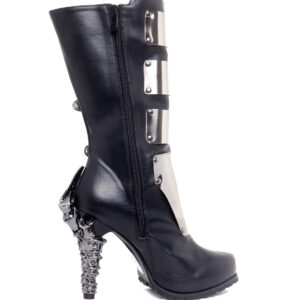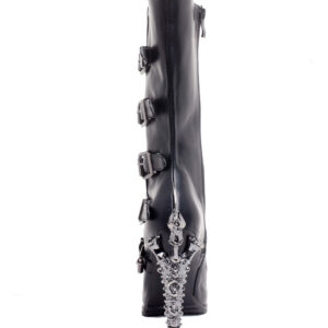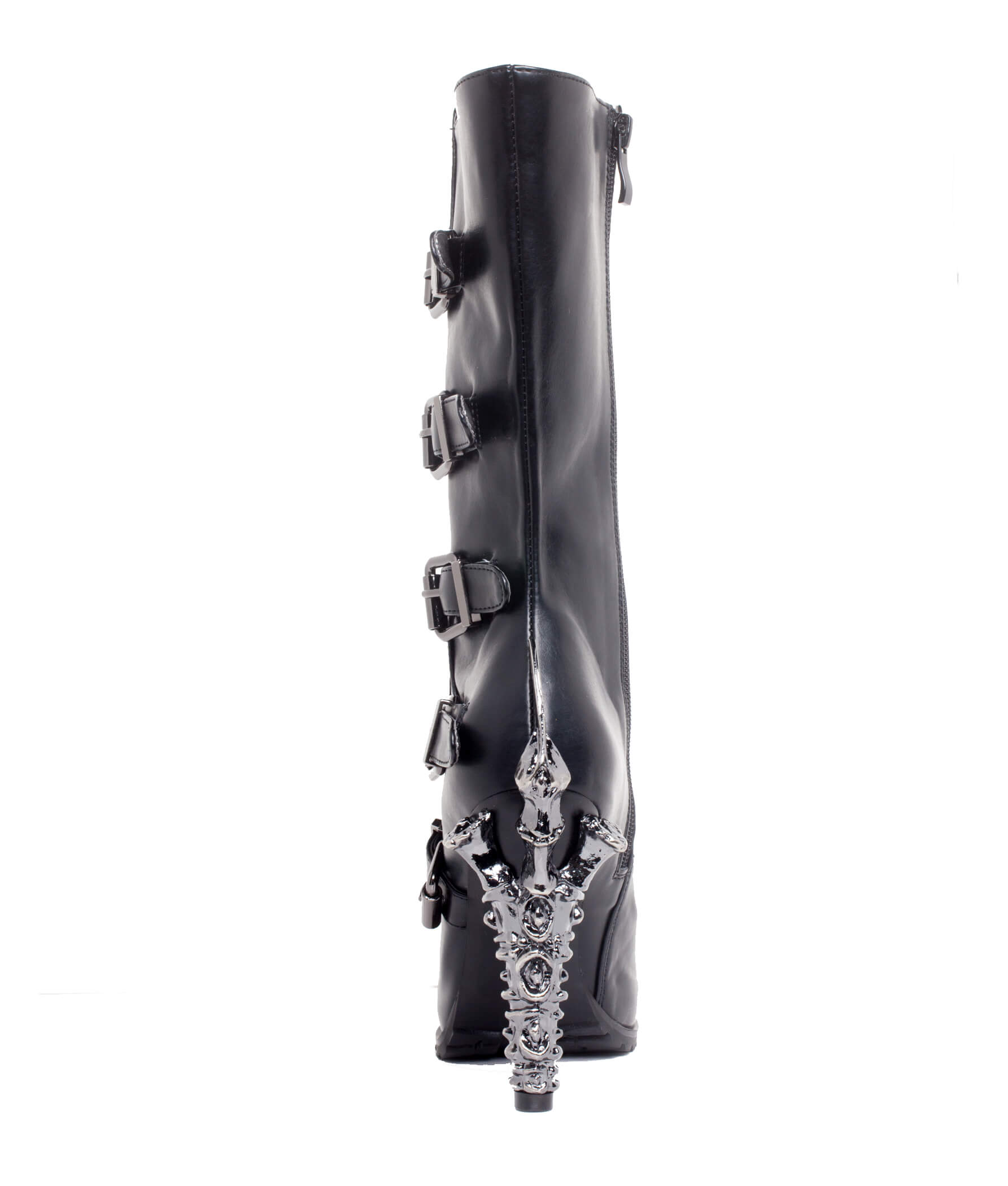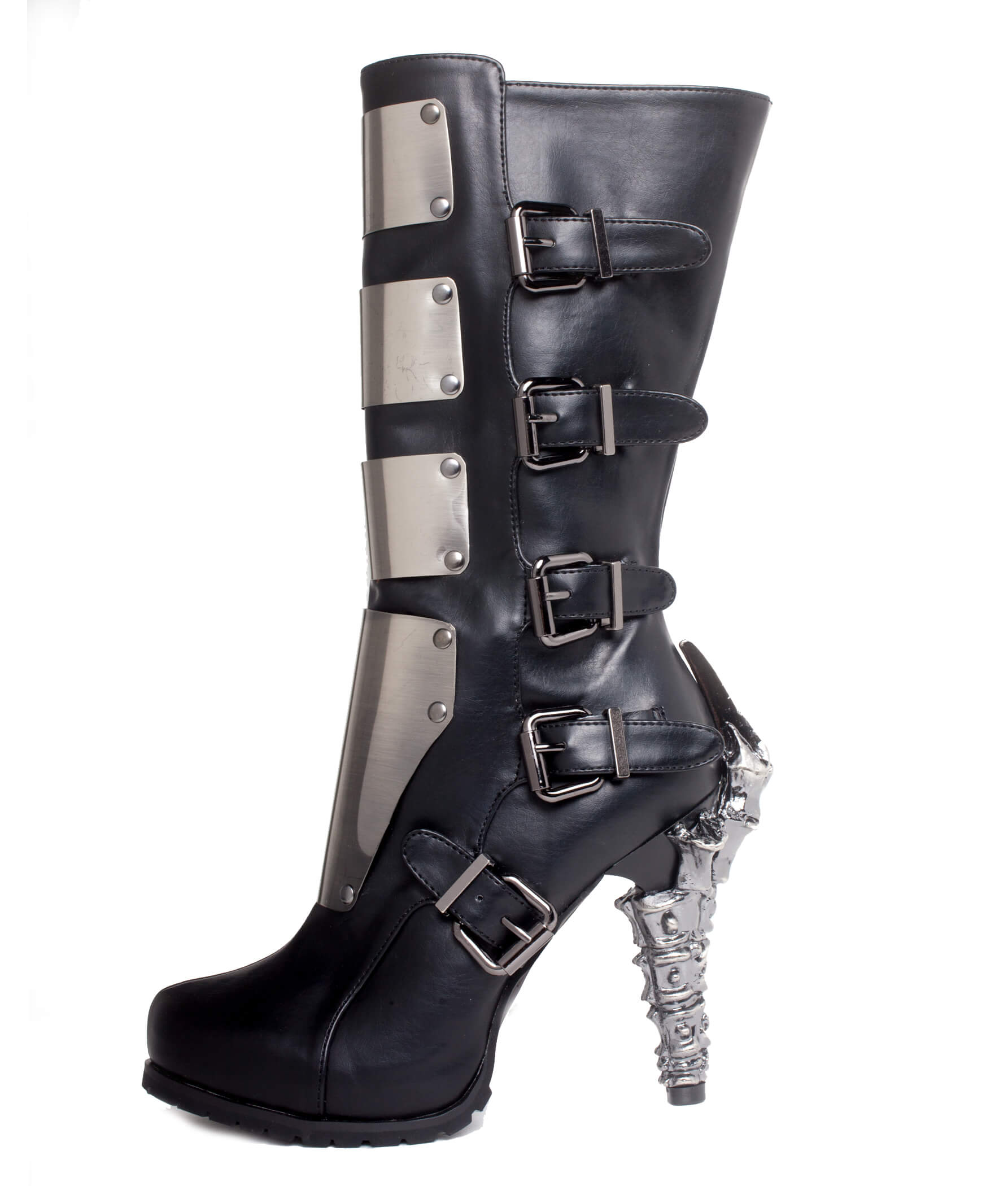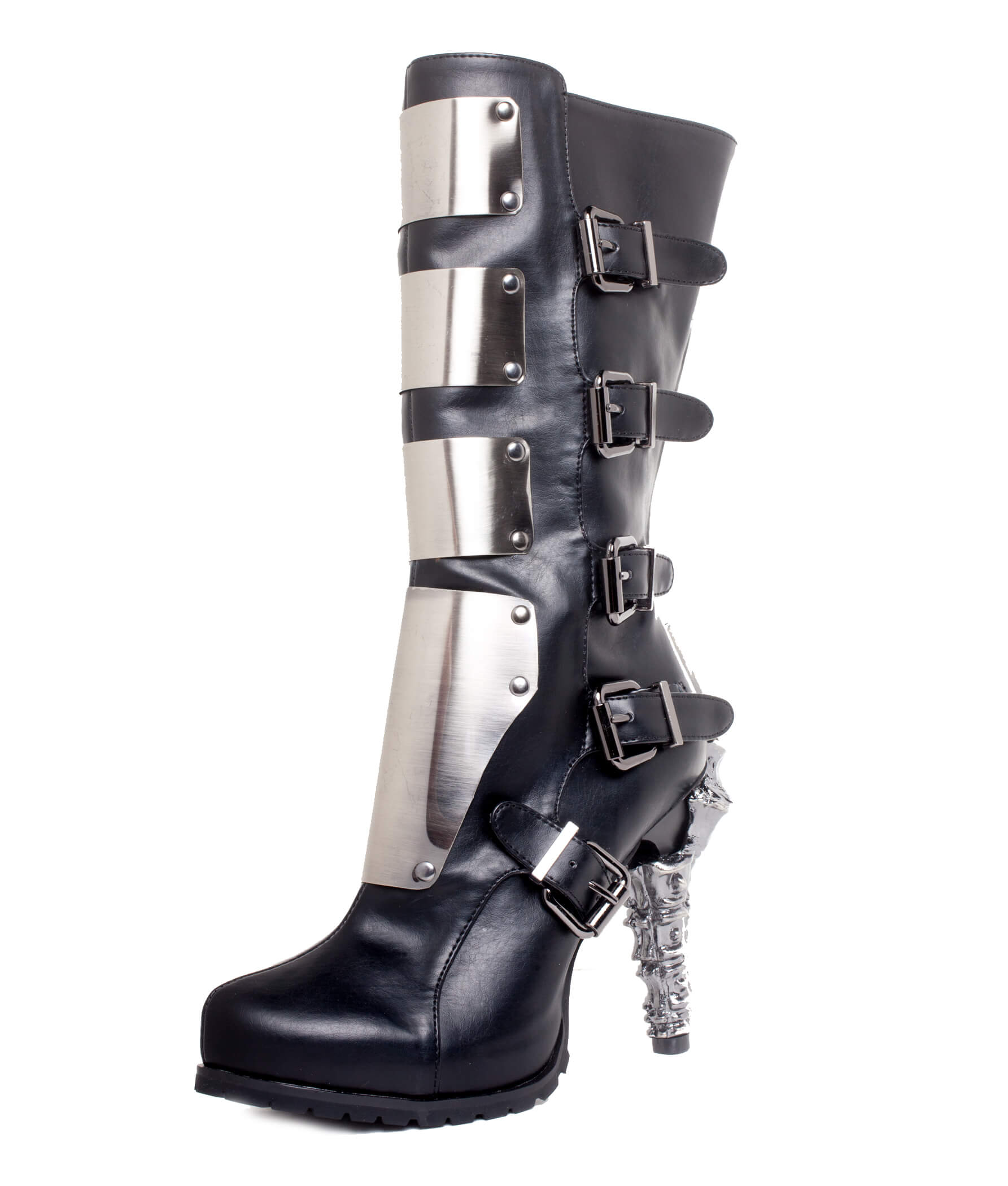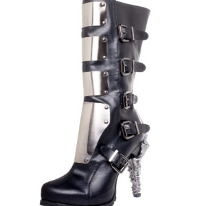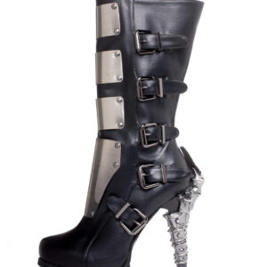 Knee high biker boots with custom cut metal plates, inner zipper included with adjustable side buckles, double cushion insole with think rubber outsole for added comfort, designed on our new prehistoric 5″ claw heel!