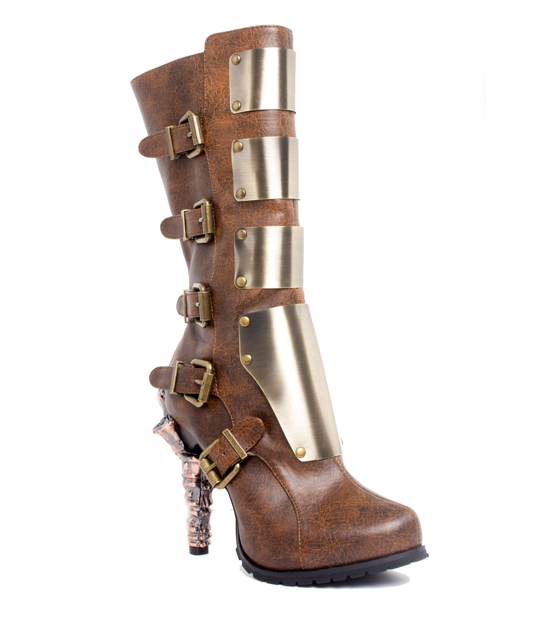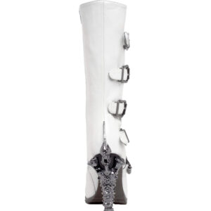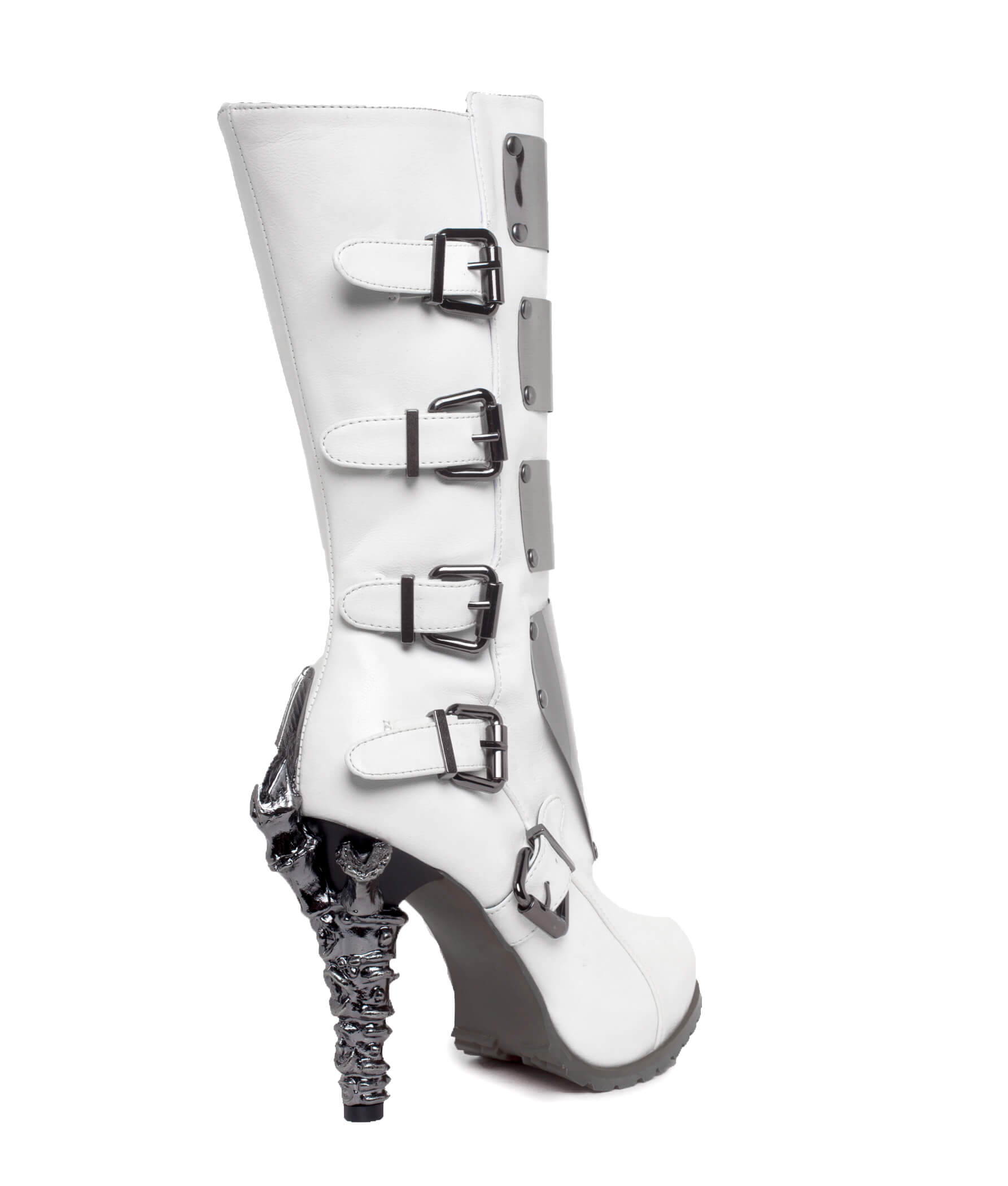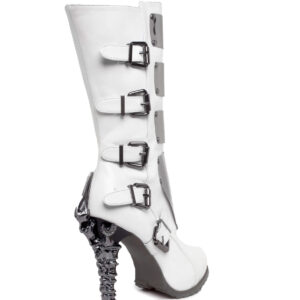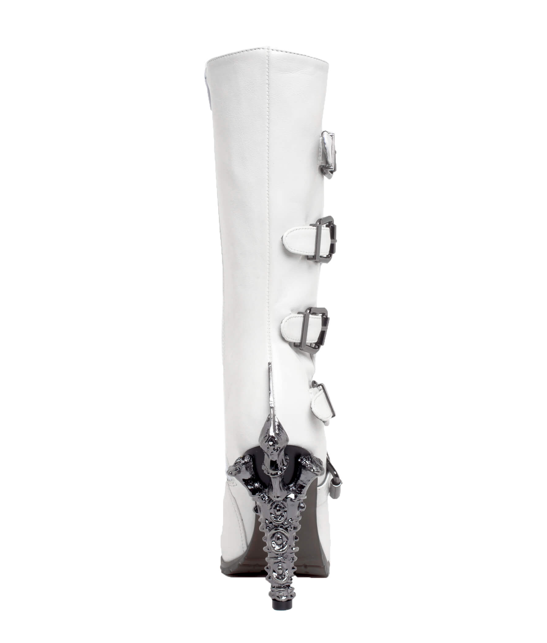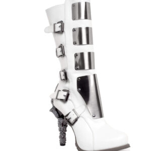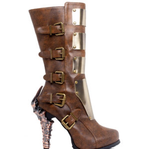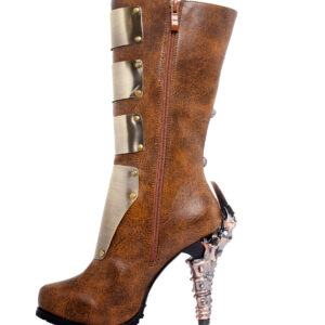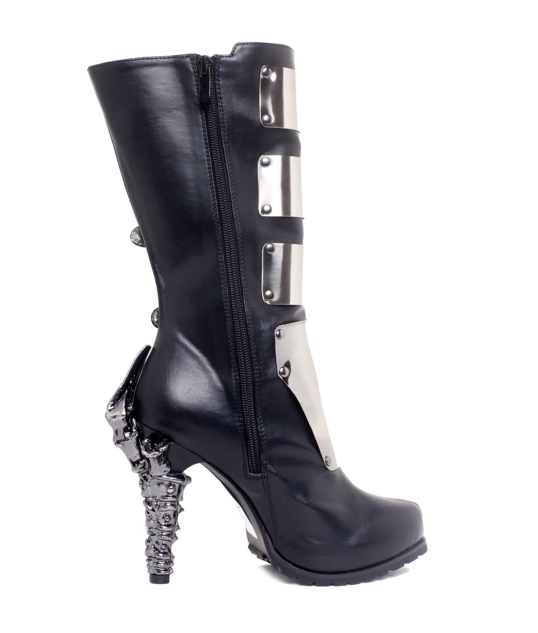 Knee high biker boots with custom cut metal plates, inner zipper included with adjustable side buckles, double cushion insole with think rubber outsole for added comfort, designed on our new prehistoric 5″ claw heel!