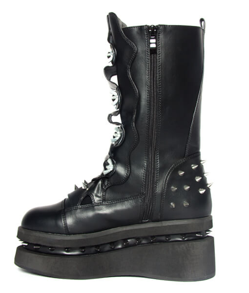 Black platform boot with seven buckle straps. Layered platform spikes between soles and on heel. Pleated front accented with silver wing nuts.