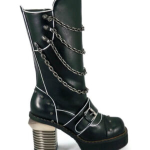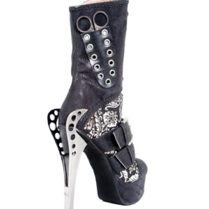 Black platform boot with seven buckle straps. Layered platform spikes between soles and on heel. Pleated front accented with silver wing nuts.