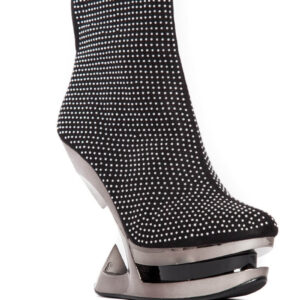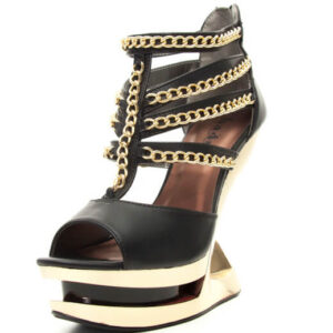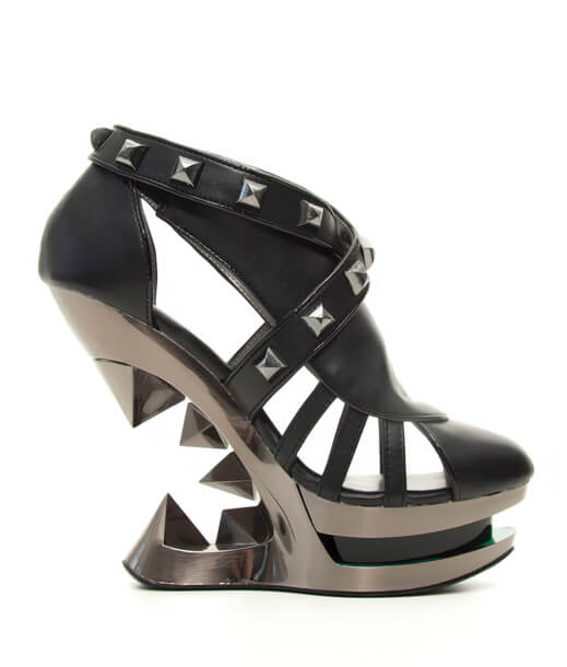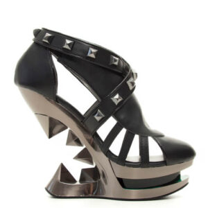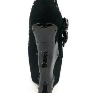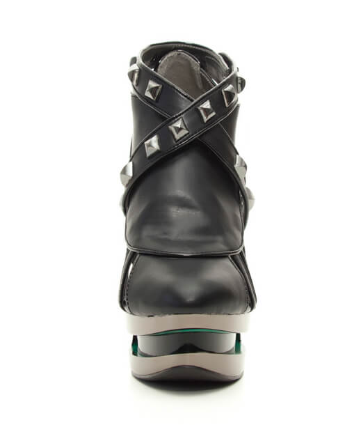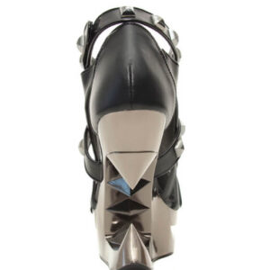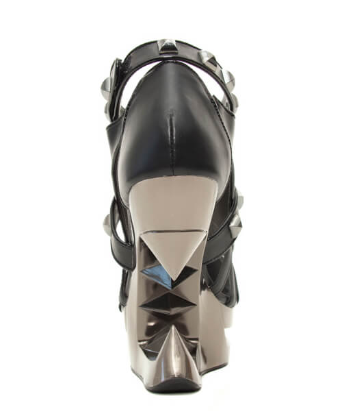 Closed toe black platform iceberg wedge shoe with partially studded straps.