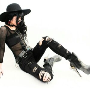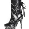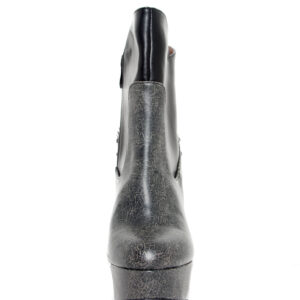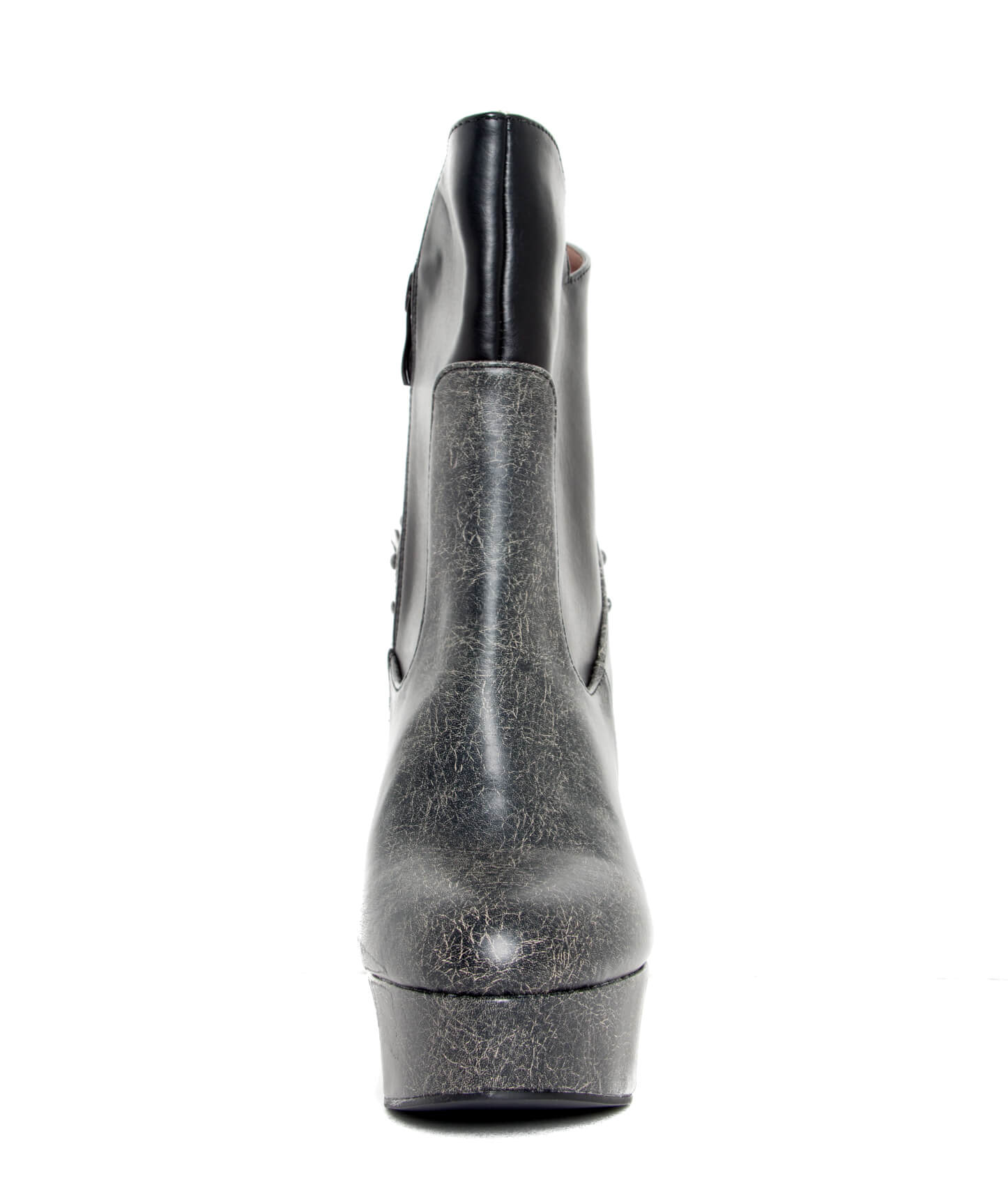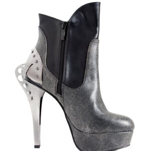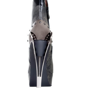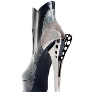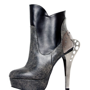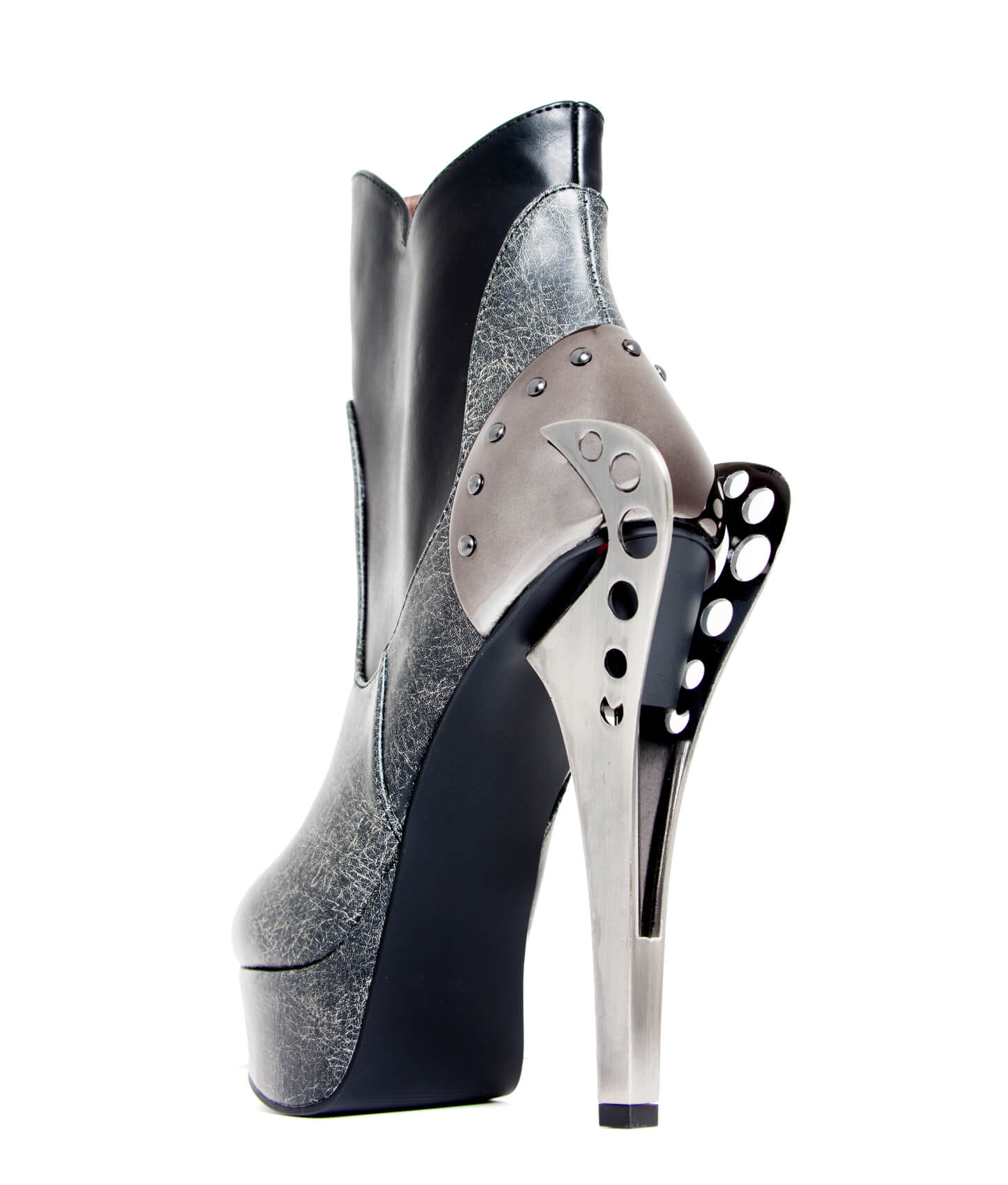Cyber vintage inspired two tone layered ankle bootie with inner zipper, industrial metal butterfly heel with matching metal back-piece.