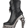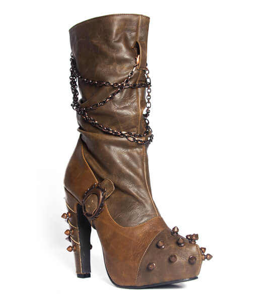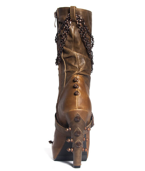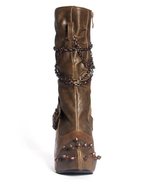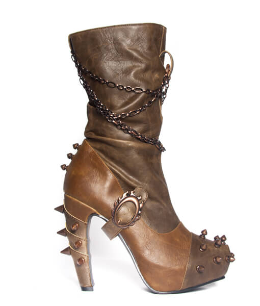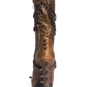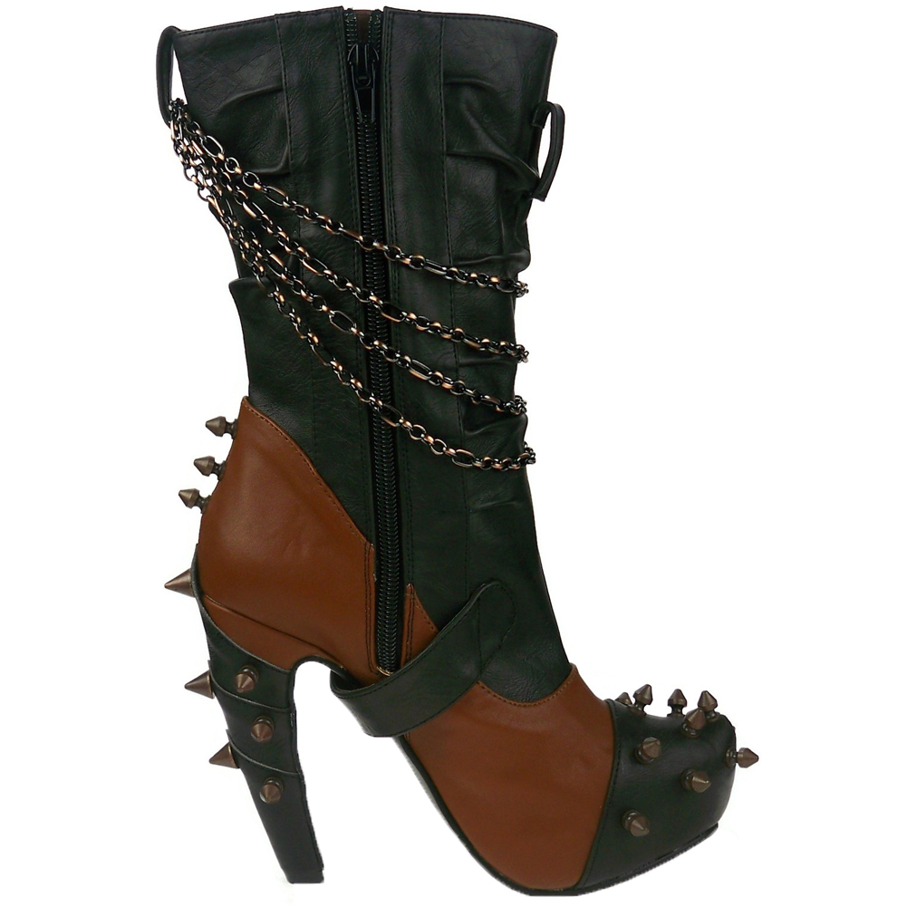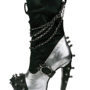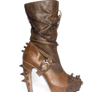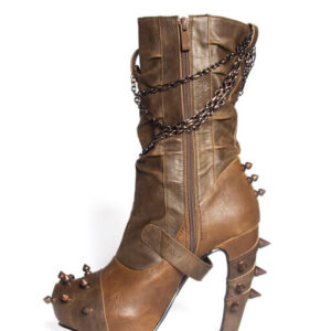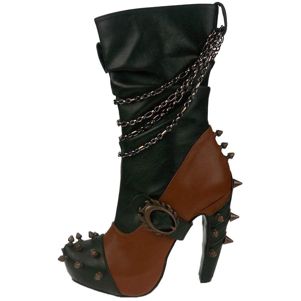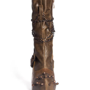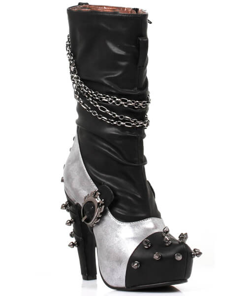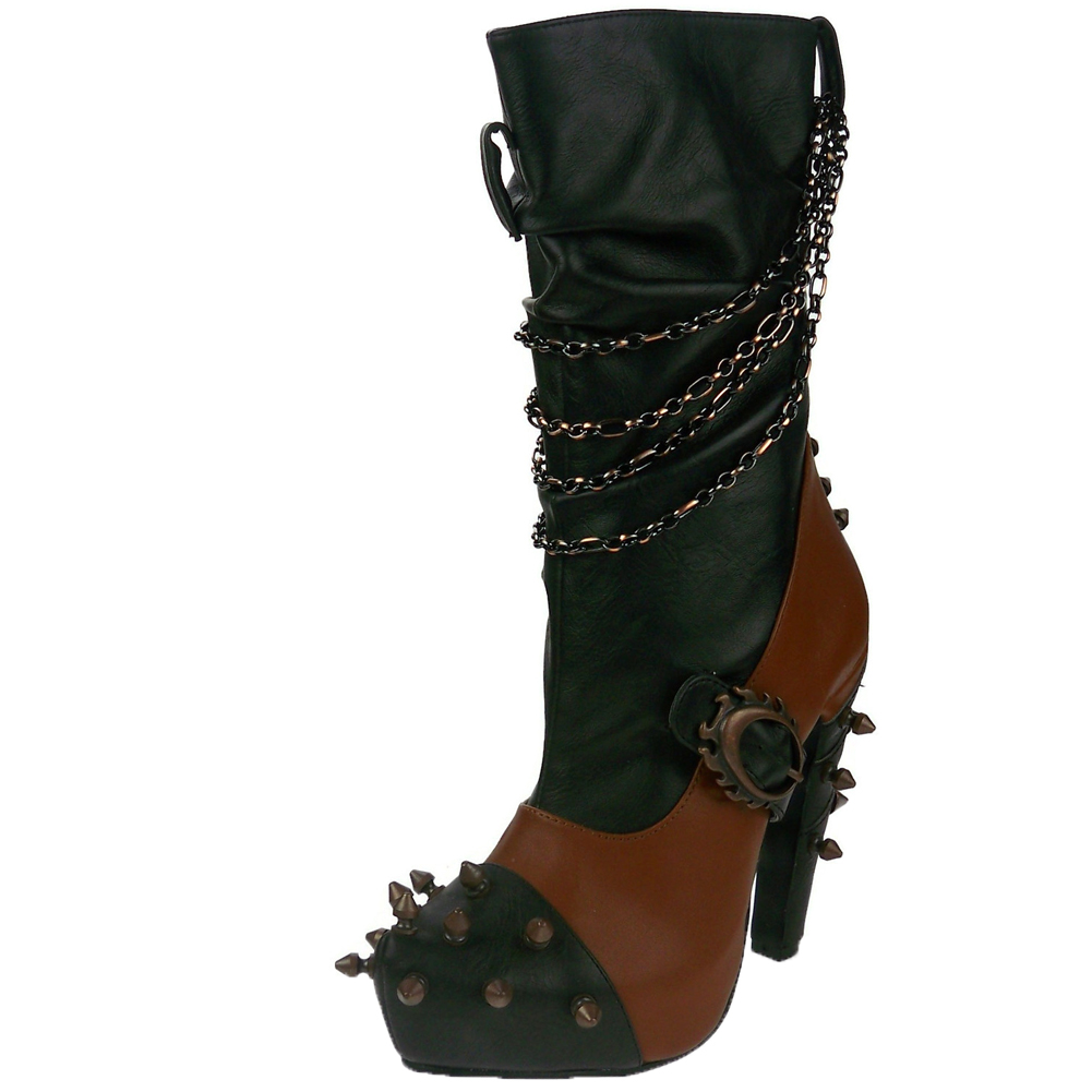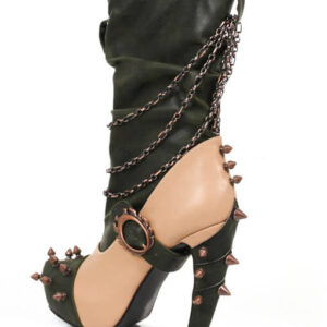 Black Friday/ Cyber Monday Sale on Black/Brick, Tan/Green and Brown/Beige. Unleash your inner rebel with Faline! This two-toned, mid-calf boot comes in contrasting colors while matching metal chains dangle around the ankles and spikes cover the toe and heel. Unque ruffled and layered upper. Adjustable flame buckle on the side. 5″ heel and 1″ concealed platform.