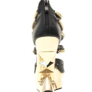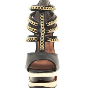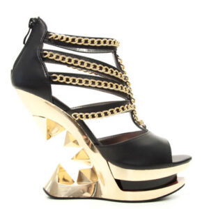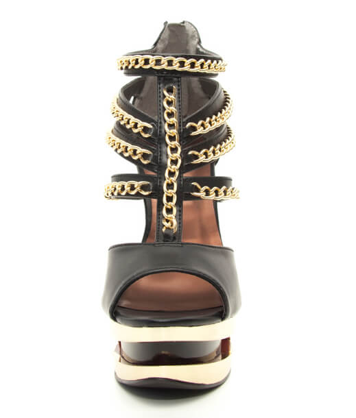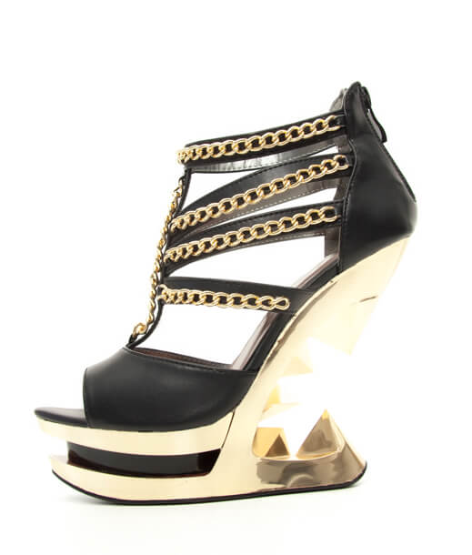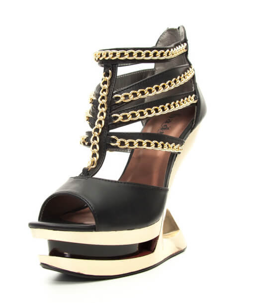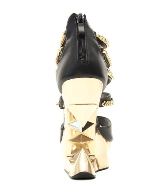 Peep toe gold iceberg platform wedge with middle and side straps lines with gold chains.