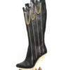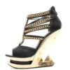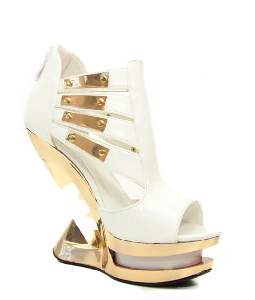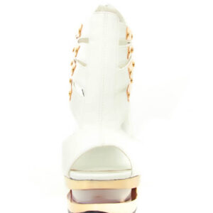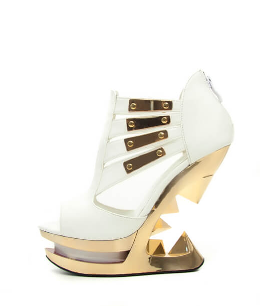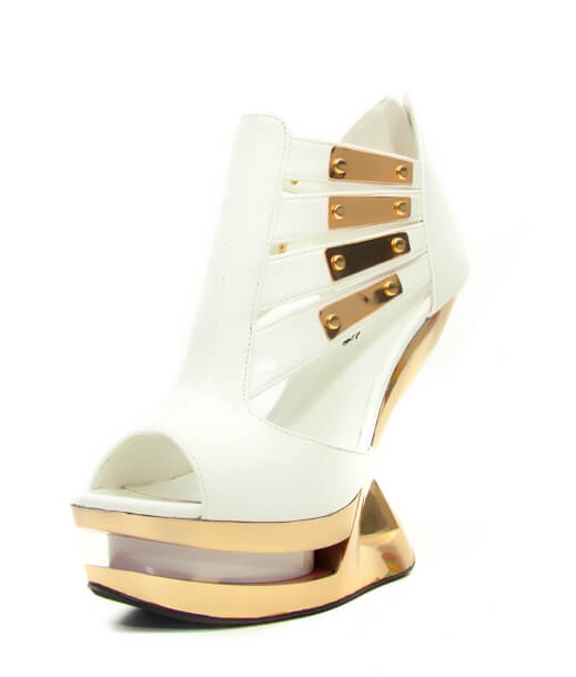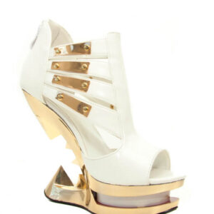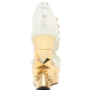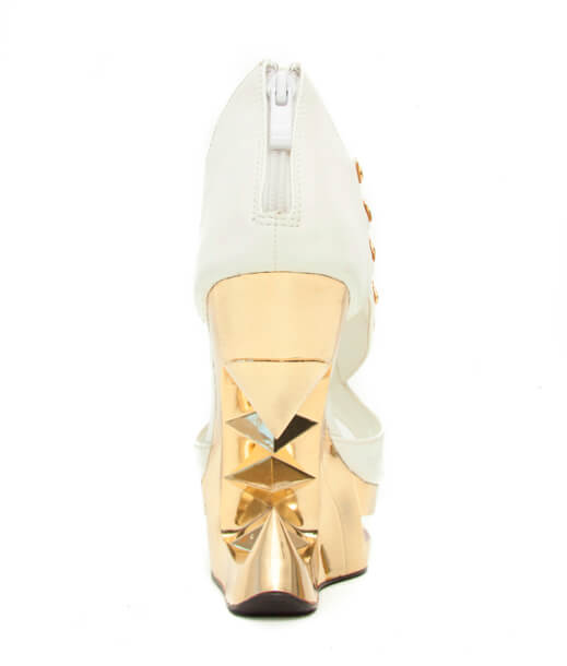 Peep toe golden iceberg wedge in white. Gold plated straps with back zipper.
