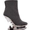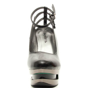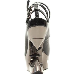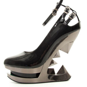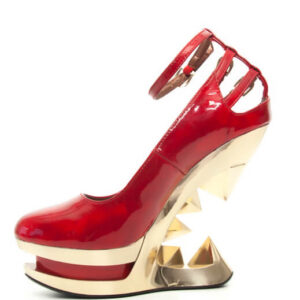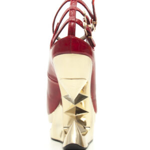 Patent leather iceberg wedge pump in black/metal or red/gold colorways. Three cut out ankle straps with buckles.