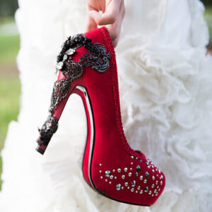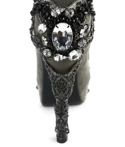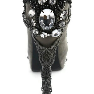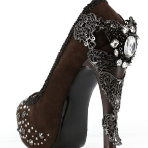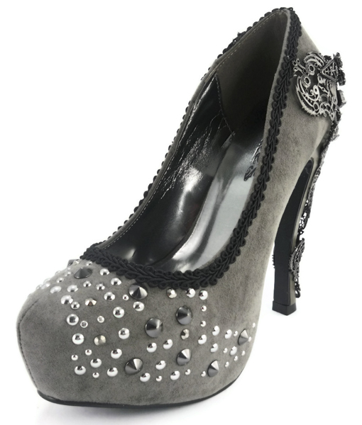 Victorian renaissance themed molded heel w/ mock swarvoski crystals in center. Micro-suede upper w/ inner lining & matching outsole. Assorted mini-pyramid studs mixed with circular metal studs in front area