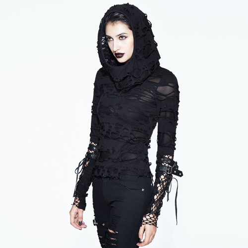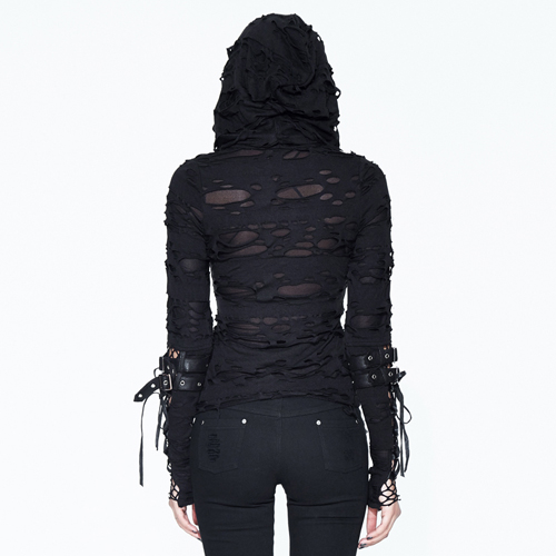 Elastic broken hole knitted fabric Thin and lightweight matching hood Breathable material Cuffs are spliced with mesh and loops stitched, made to look like gloves Custom shabby design for the imperfectionist Size measurement chart included for reference