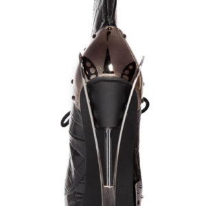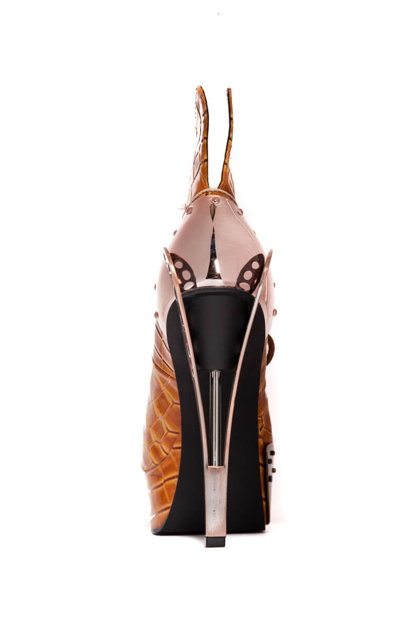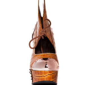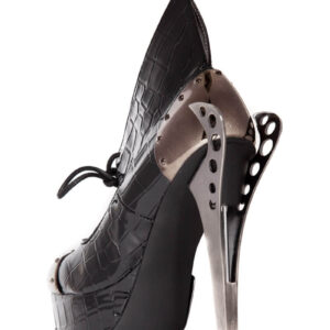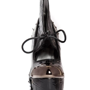 Steampunk inspired. Double sided custom cut metal heel. 1.5″ platform. Matching armor pieces with front metal toe cap. Layered faux snakeskin upper. Adjustable front laces. Available in Orange and Black.