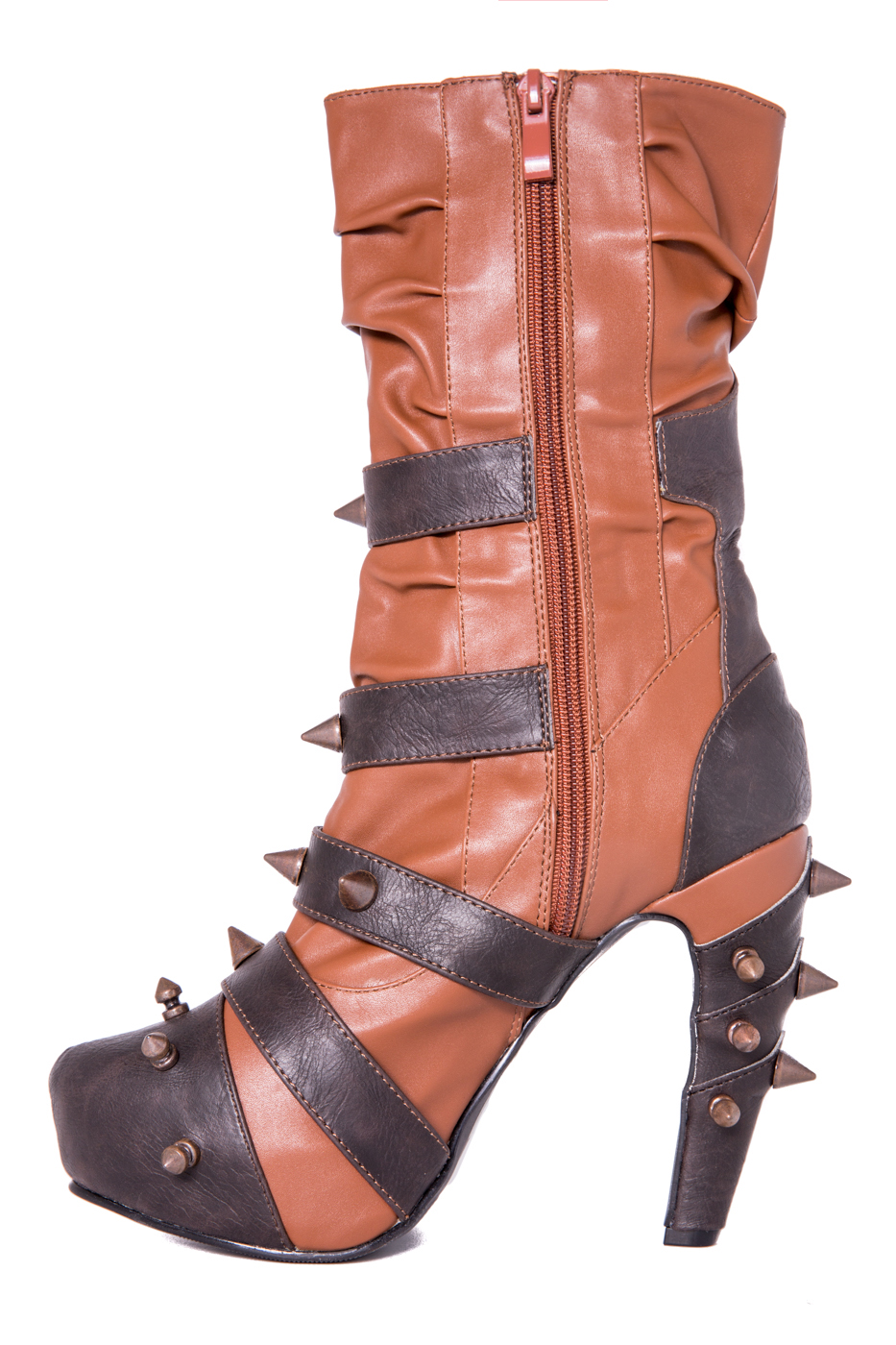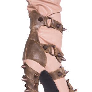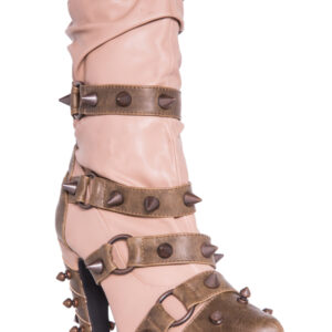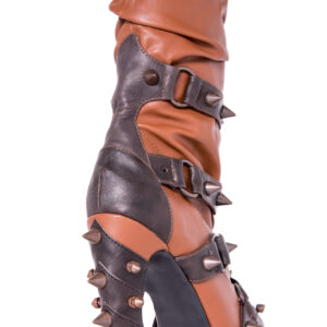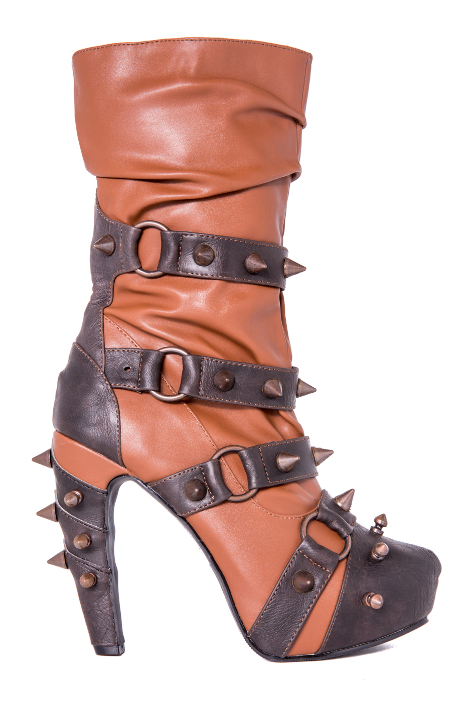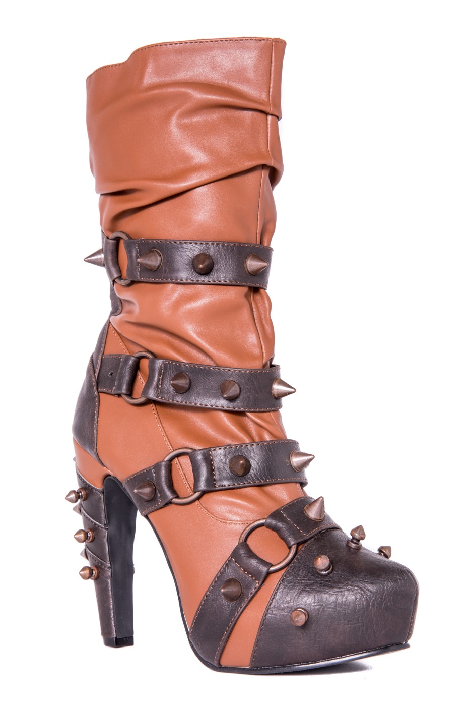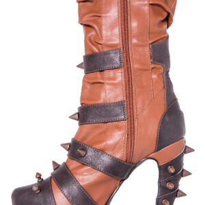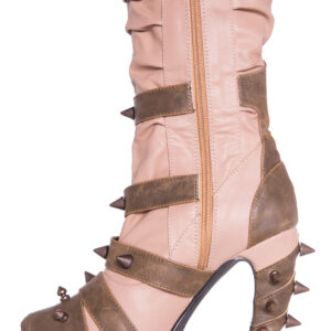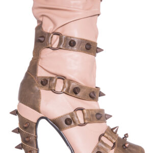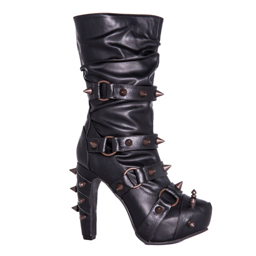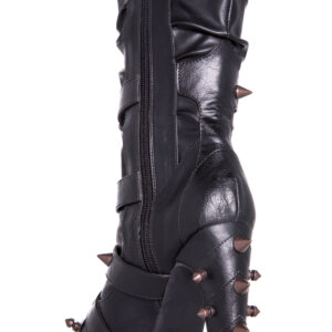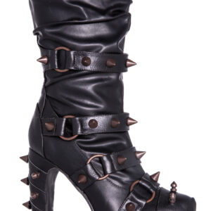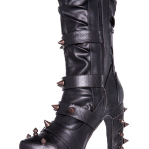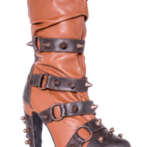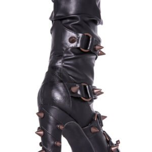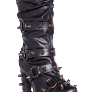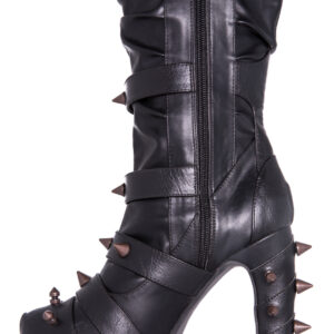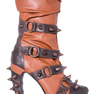 Hades two-toned, mid-calf boot is packed with a punch! Matching color spikes adorn boots, fastened by matching metallic ring. Steampunk rivets lined in front while back spikes are hand sewed and fastened onto second faux-leather PU layer. Unique ruffled and layered upper. 5″ heel with 1″ concealed platform.