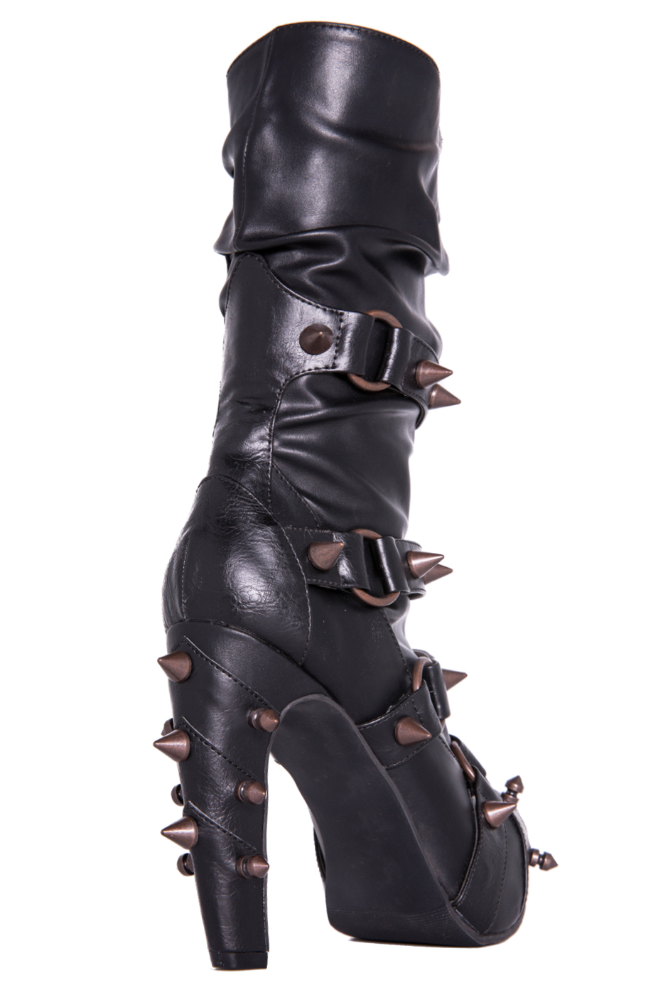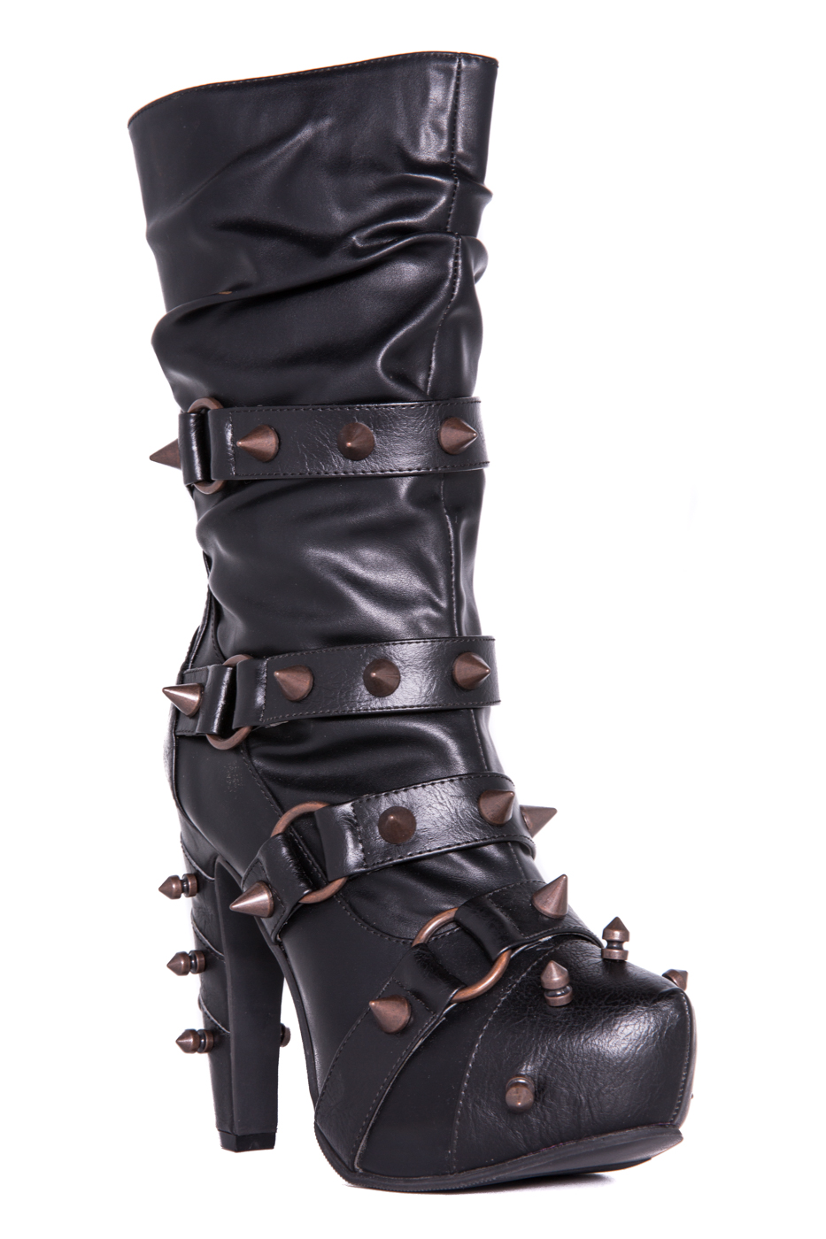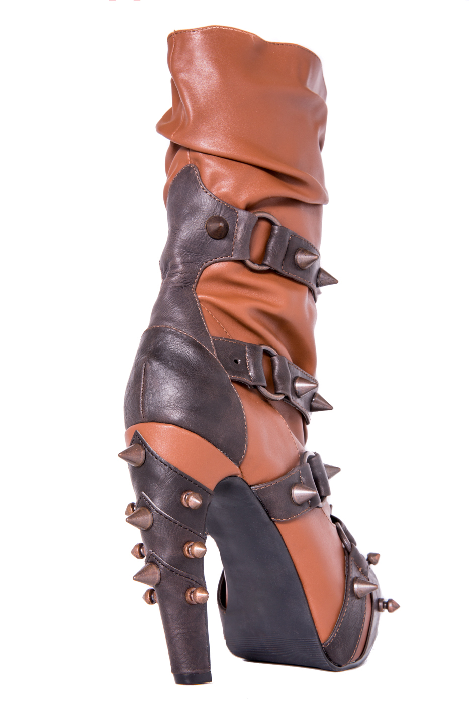 Hades two-toned, mid-calf boot is packed with a punch! Matching color spikes adorn boots, fastened by matching metallic ring. Steampunk rivets lined in front while back spikes are hand sewed and fastened onto second faux-leather PU layer. Unique ruffled and layered upper. 5″ heel with 1″ concealed platform.