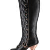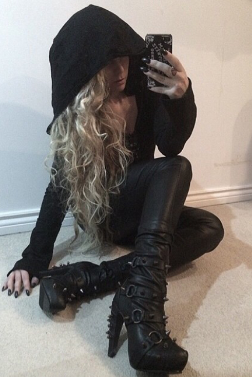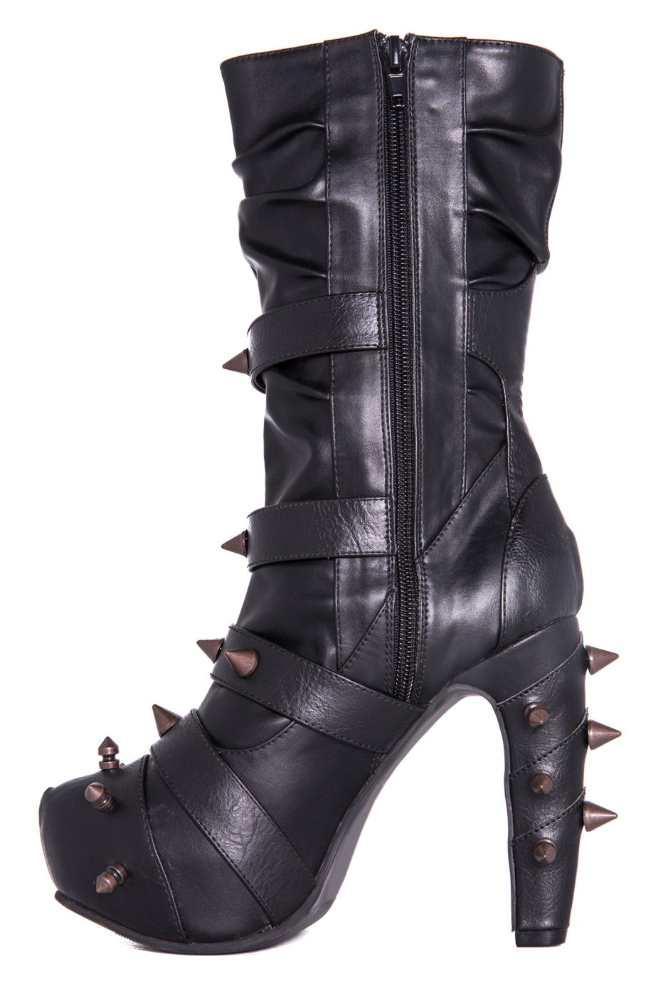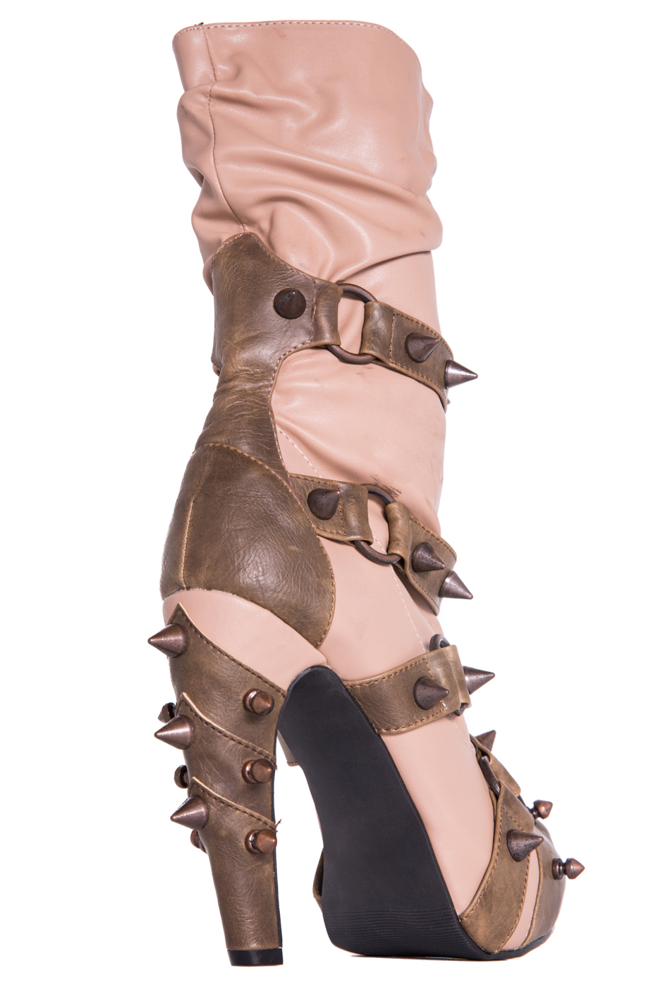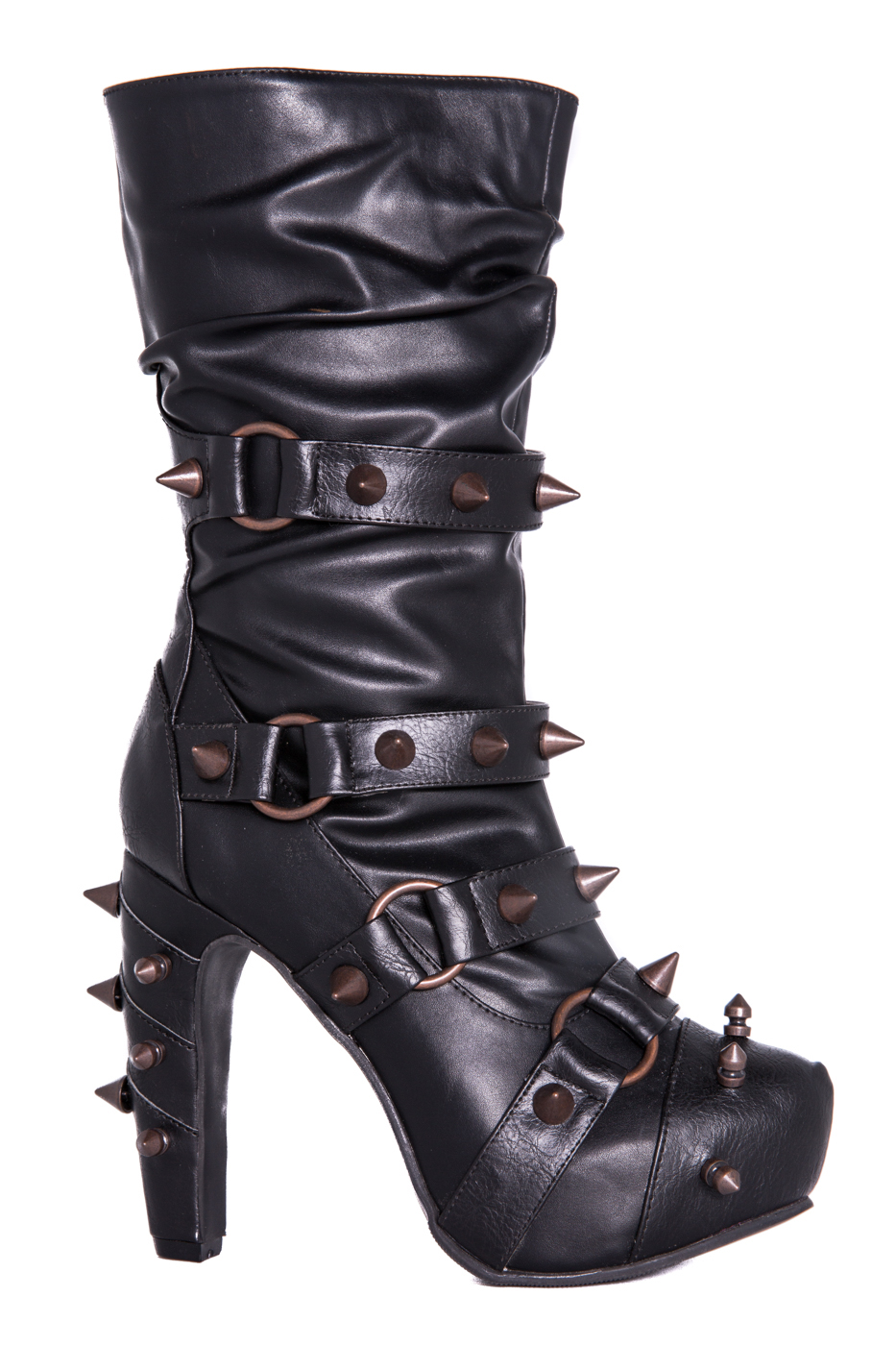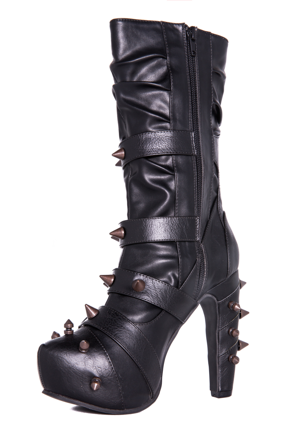 Hades two-toned, mid-calf boot is packed with a punch! Matching color spikes adorn boots, fastened by matching metallic ring. Steampunk rivets lined in front while back spikes are hand sewed and fastened onto second faux-leather PU layer. Unique ruffled and layered upper. 5″ heel with 1″ concealed platform.