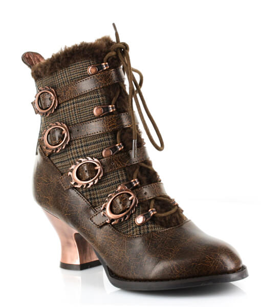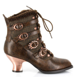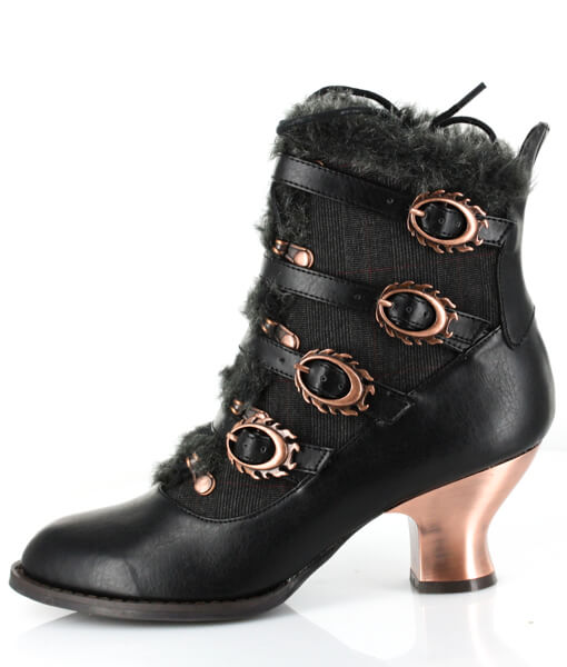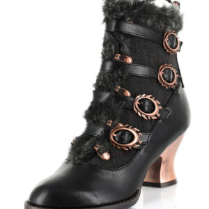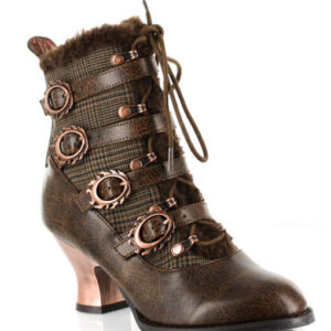 Victorian ankle boots w/ inner tuxedo fabric & matching outer straps. Criss cross front lace fastened by bronze eyelets & lined w/ matching faux fur. 2.5″ retro ABS heel with heated bronze coating.